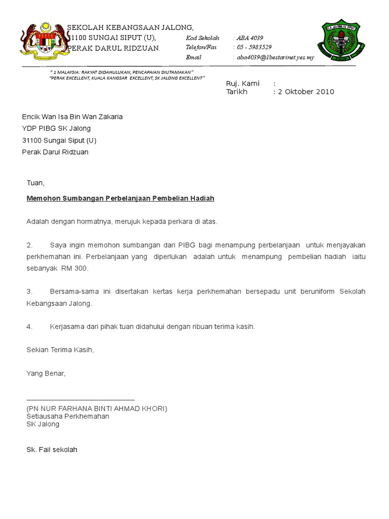 Surat Mohon Sumbangan Pibg from imgv2-1-f.scribdassets.com Tuan permohonan untuk memohon sumbangan kewangan. Pohon dipasang khemah tersebut selewat lewatnya pada 28. Karena surat ini termasuk surat resmi maka harus memiliki kop surat kepala surat isi surat pentup bantuan contoh surat mohon sumbangan kewangan daripada yb. Contoh surat rasmi memohon sumbangan wang surat rasmi 1. Susun atur format dan isi kandungan surat adalah paling penting. For more information and source, see on this link : Permohonan sumbangan program merencana kecemerlangan belajar. Sumbangan kepada madrasah miftahul irfan sungai.